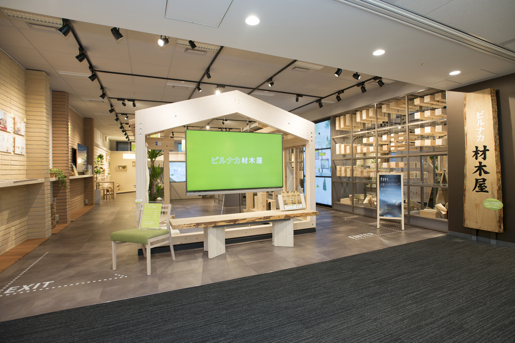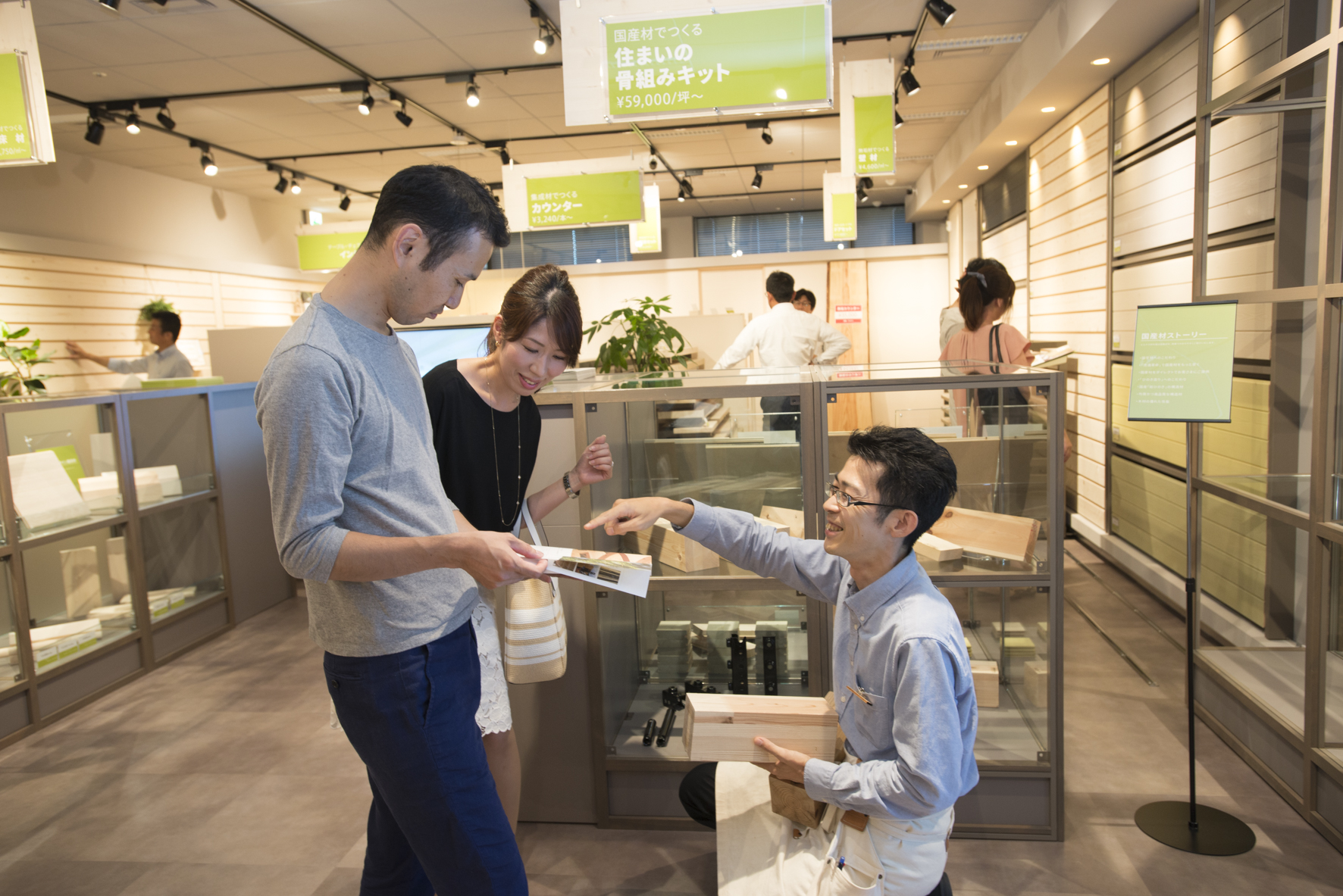 「ビルナカ材木屋」は、木造住宅の構造材の樹種や工法を、一般消費者が自ら見て・触れて、選択・購入できる店舗です。自社工場を含めた提携工場のネットワークを利用して、原木の仕入れから製造・加工までを一貫体制で行うこと、ECサイトを活用して営業効率を高めることで、高品質な国産材を低価格で提供しています。