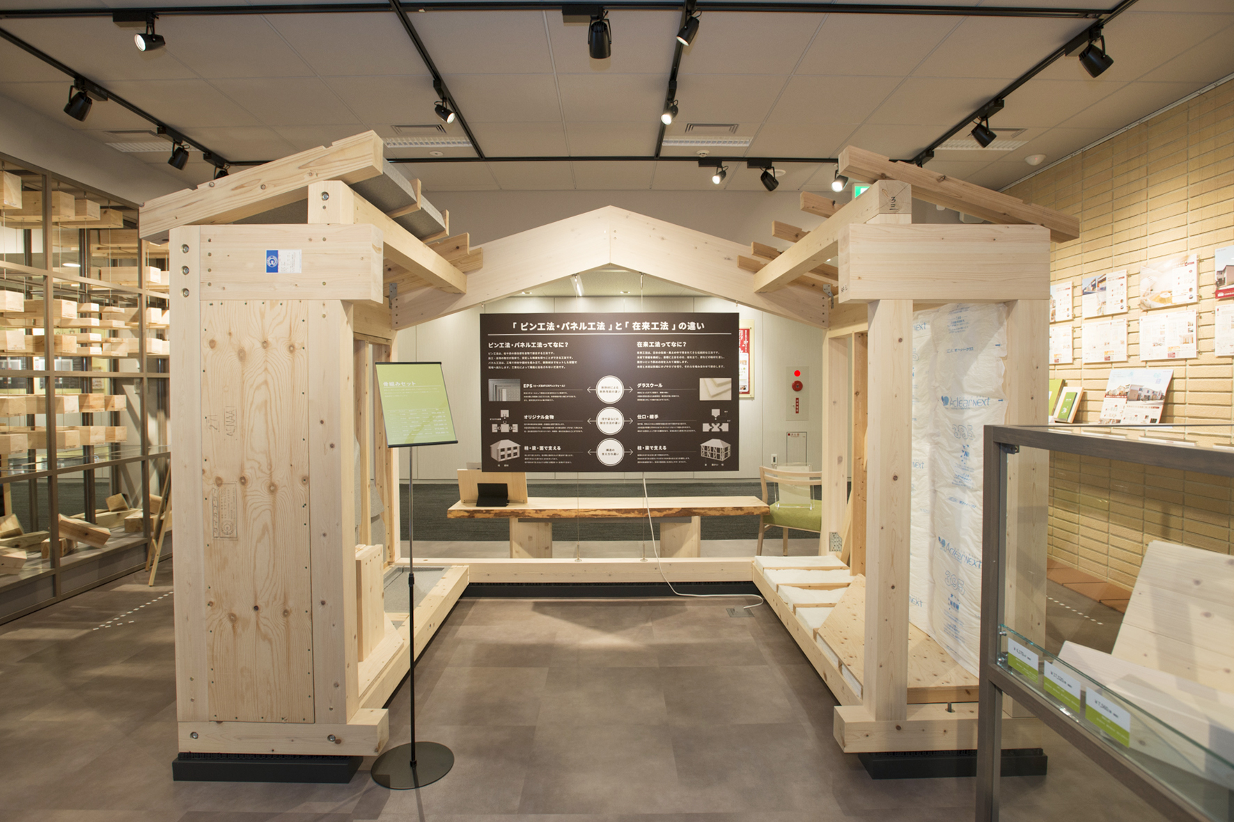 都心のオフィス内の木材利用のコミュニケーション拠点として、表現が巧みで洗練されている。一般消費者にはわかりにくい構造材の材種や工法を自ら選べる場所と機会を提供する機能は極めて有効だ。