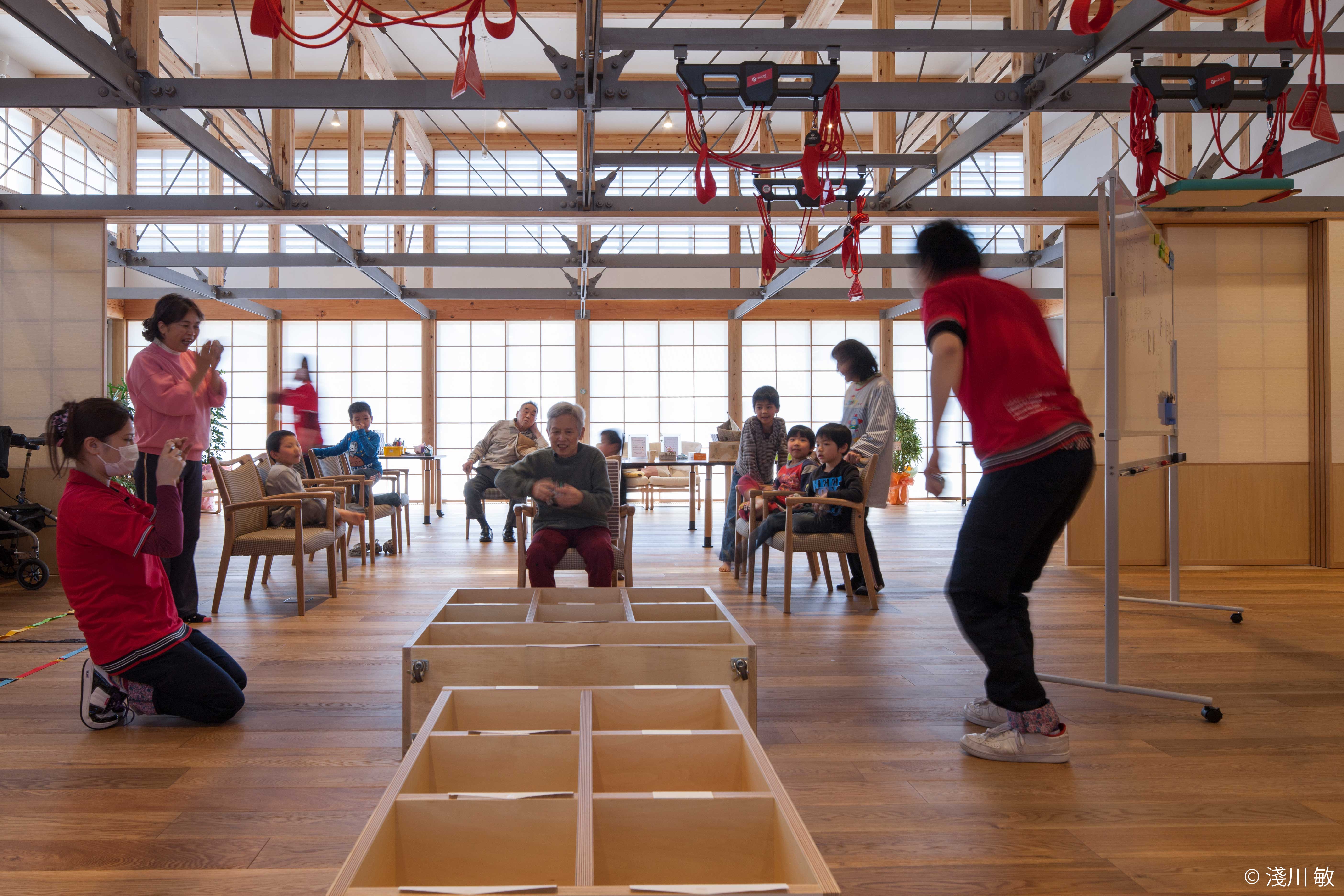 福井県でも山深いこの地域は、著しい高齢化に見舞われています。隣は60床の特別養護老人ホームで、地域の高齢社会の拠点です。こうした収容施設以外にも、在宅高齢者の健康を支える施設やサービスが必要となり、同社会福祉法人が地域社会への貢献を目的にこの施設を建設しました。中心の12m×12mの無柱の木の大広間は、2つに区切れ、通常はデイサービスとして高齢者の健康維持を図るための活動を行う他、在宅介護をサポートします。要介護高齢者の収容ではなく、地域全体で在宅高齢者の健康維持や介護を担おうとする流れを促す施設です。