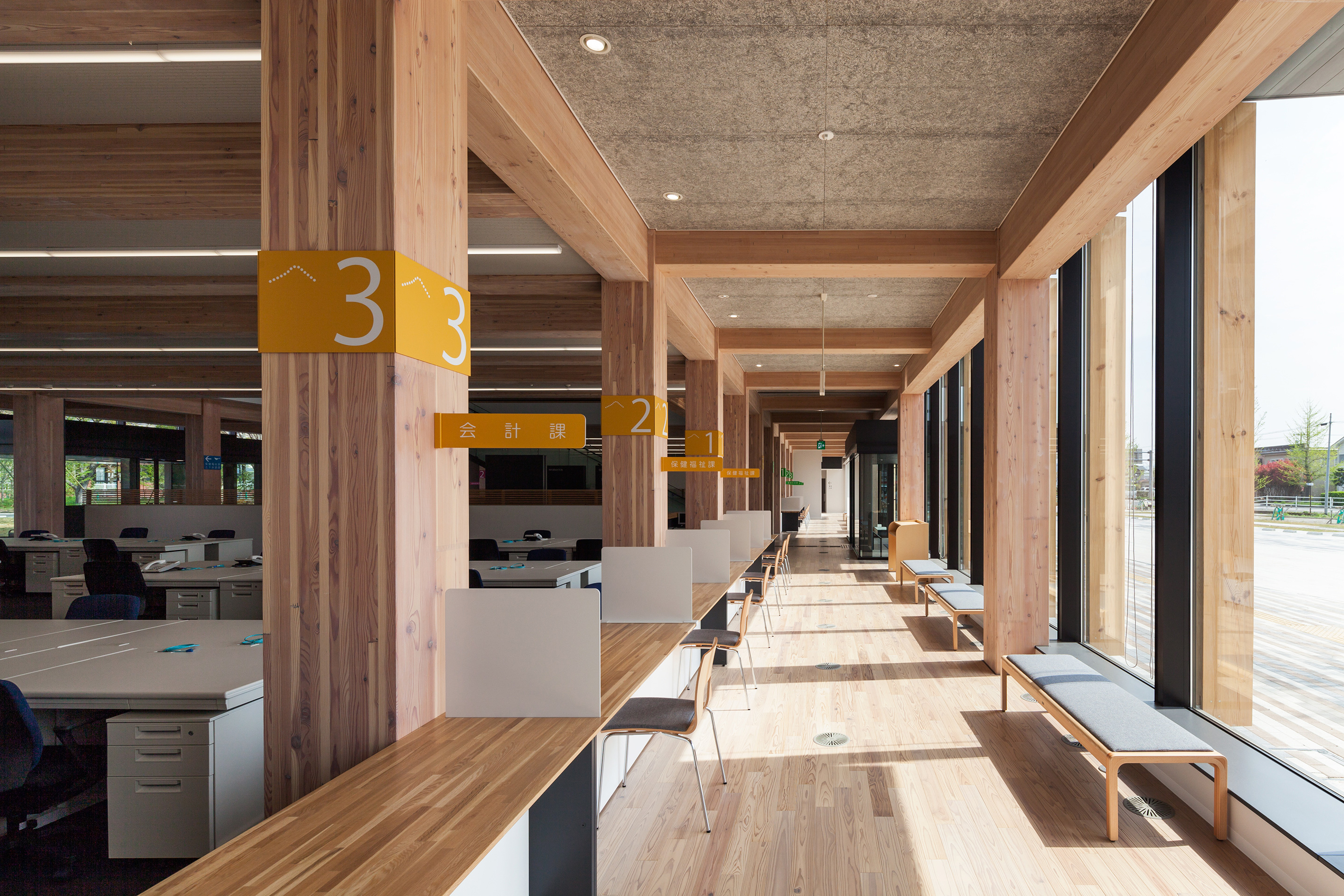 東日本大震災で大破した庁舎の新築計画である。町民が身近に接する公共建築なので、最も親しみのある木の架構に包まれた空間がよいと考えた。外装にも積極的に木材を使用し、内部の木架構を外部へ表出させる透明なファサードとし、広場の樹木や山の風景と庁舎の一体化を試みた。耐火建築物であるため、鉄骨の躯体(柱・梁)を県産材のカラマツ集成材により耐火被覆し、現しとした。地場産木材を使用し、町民が親しみをもって利用できる内装も実現し、地域産業が多く参画している。