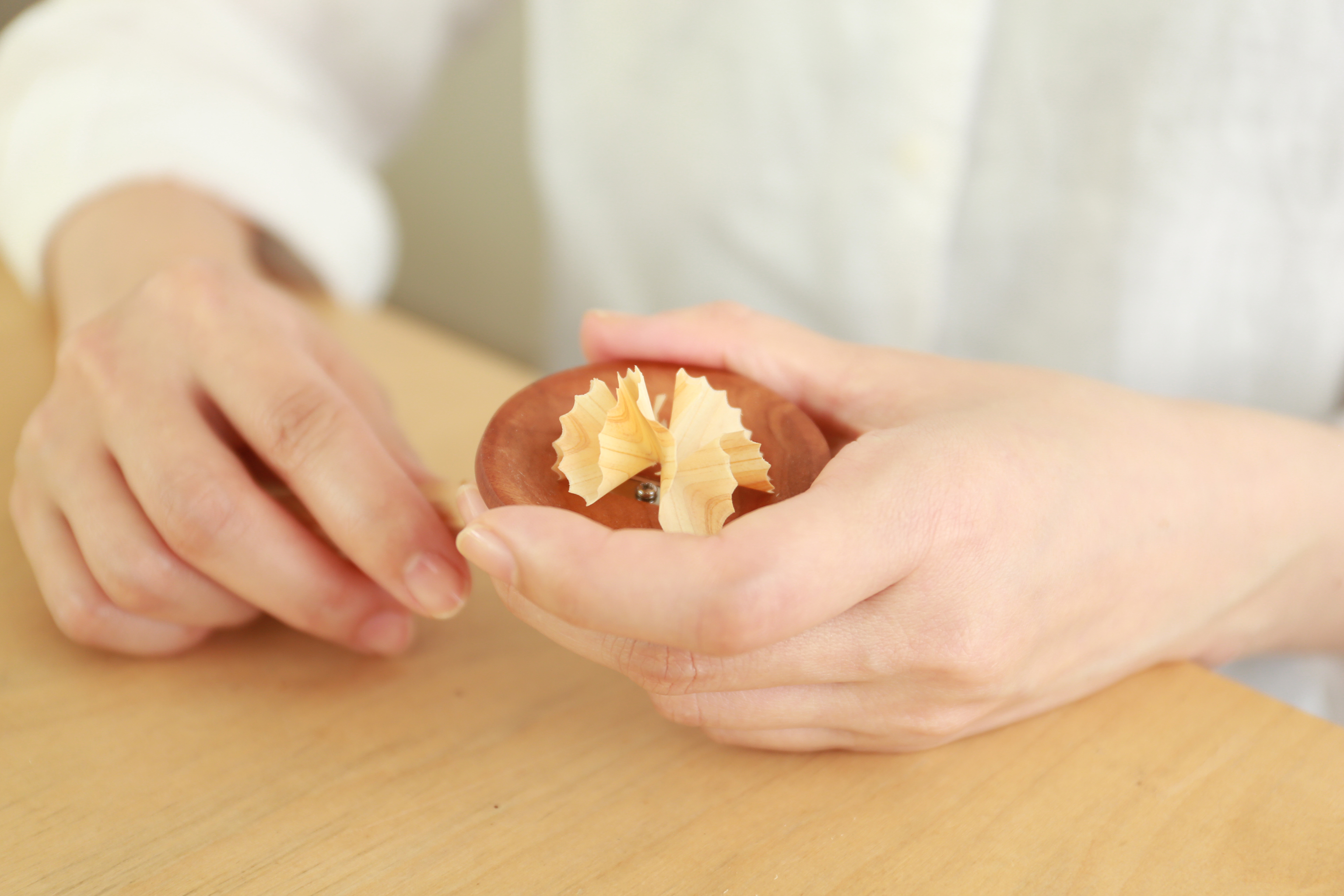 削るという行為で各々の木の魅力に気づかせ、木とのコミュニケーションを深める。触感や香り、木目など五感で感じることができるアイテムである。削りカスは木粉として粘土などに利用できる。