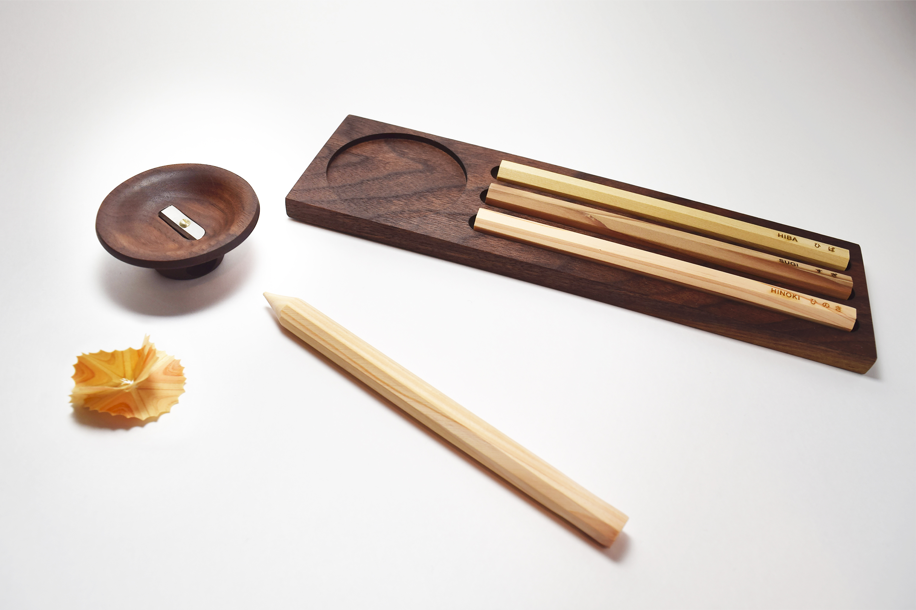 樹木が自然にもつ香りや美しさを愉しむパーソナルリフレッシングプロダクト。子どもの頃に削った鉛筆のように木を削り出すと、美しい木目が花のように広がり、木が自然にもつ清涼感ある香りが漂う。さらに「削る」という行為によって、樹種による硬さや音、木目や色味などの違いを五感を通して知ることができる。