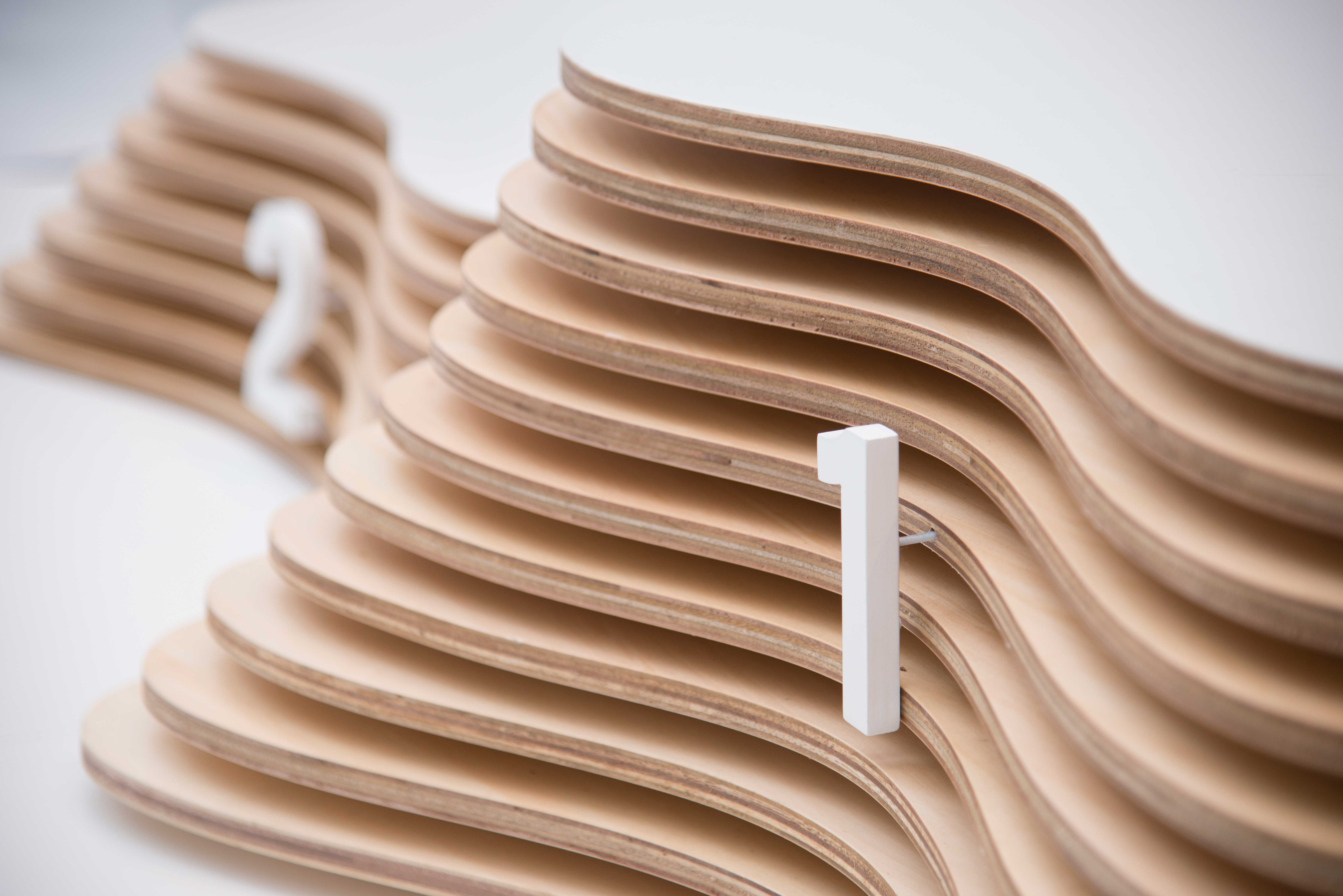 オリンピックをテーマにした展示空間でのフォトスポットの計画です。オリンピックというテーマ性から「人種」「世代」「性別」を問わず、より多くの人たちに共感してもらうためのデザインとはどうあるべきかを「木材の魅力」を活用して試みた作品です。切り株をモチーフとした表彰台は、輪郭線の異なる合板を積み重ね、加工性・経済性に優れ入手も容易な合板の複数の長所を生かしたデザインとし、静かな佇まいでありながらもインパクトを持つ独特のフォルムとなりました。