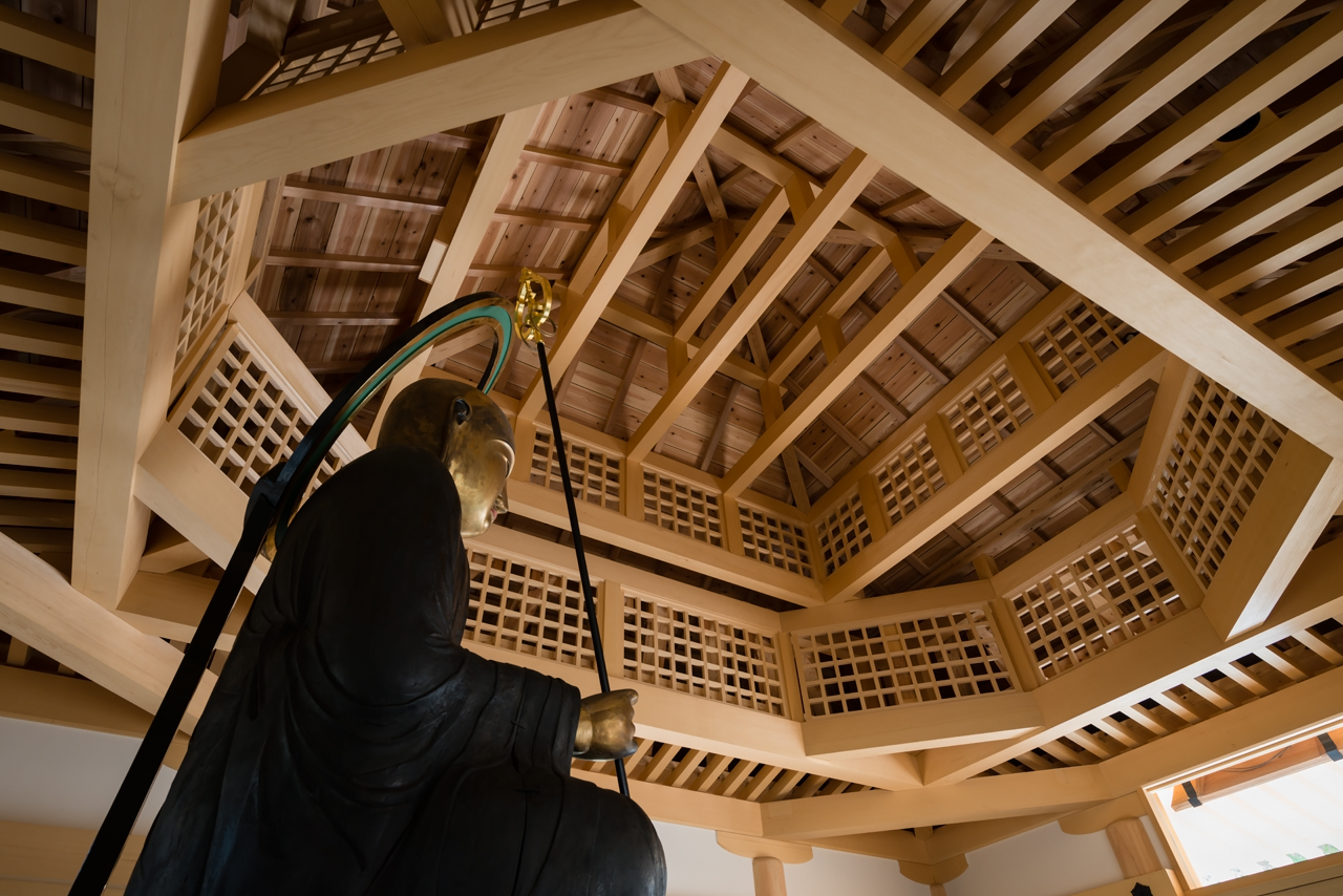 間口3間、奥行き4間ながら、設計と構造の工夫で中央上部にスペースをとり、仏像の存在を際立たせている。