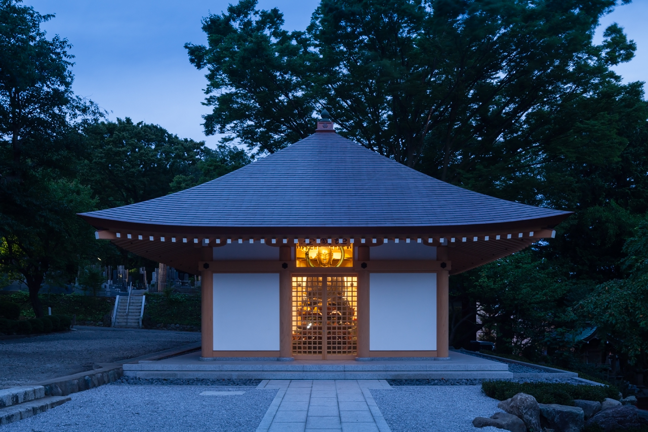 時宗の総本山「遊行寺」境内に建つ「地蔵堂」の約90年ぶりの再建です。堂宇建築は伝統の型の中での世界が確立され、自由になれない印象ですが、現在の技術も導入し、内部において伝統を踏まえつつ新しい空間を求めた試みです。既存の本堂に近接して建つ事から外観は伝統的姿とし低い構えをとる一方、内部は大きな地蔵像に相応しい拡がりと上昇感のある空間を求め、桔木等の構造を工夫し天井を張らない架構を見せる意匠としました。(伝統構法協力:飯島常夫 構造設計:萩生田秀之(KAP) 施工:鵤工舎+寺尾工舎 写真撮影:小川重雄)