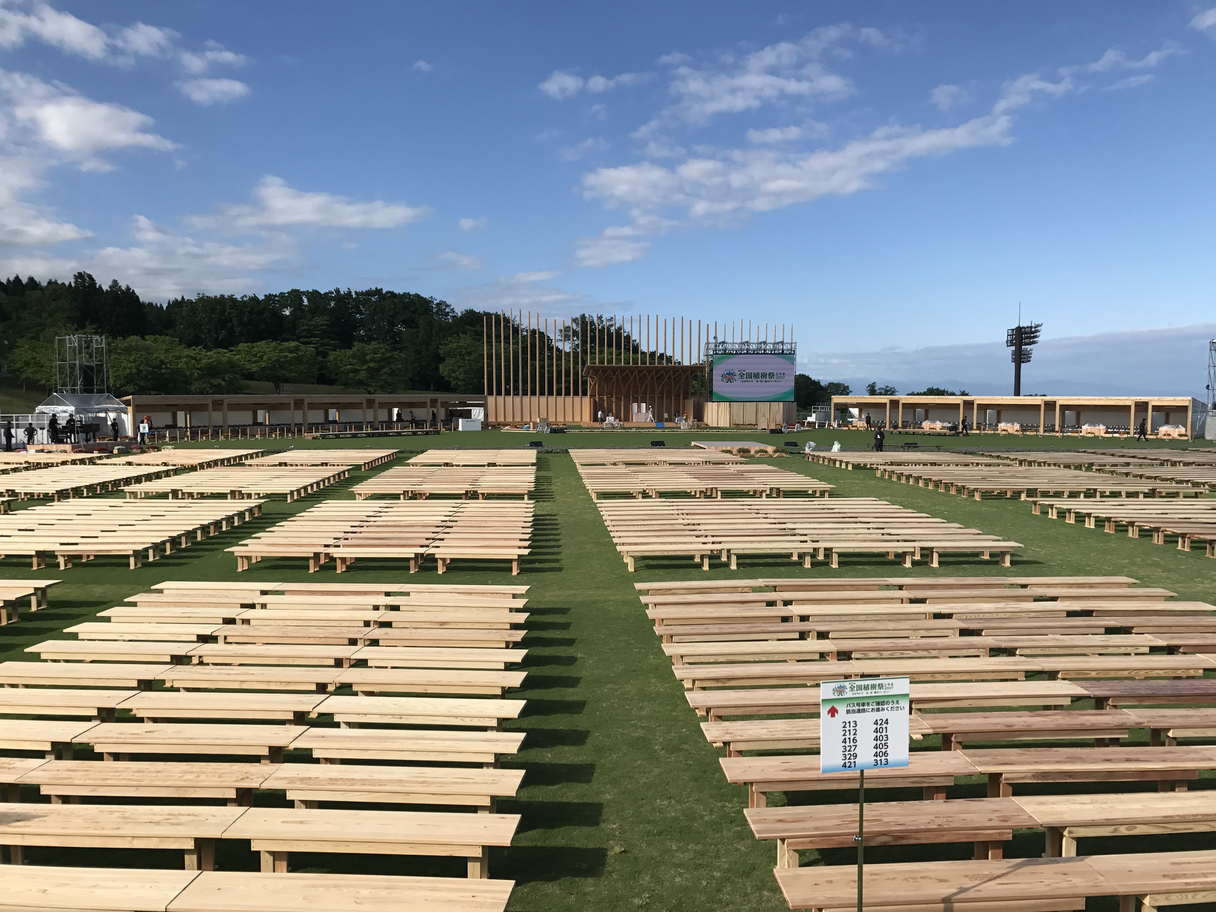 イベント参加者の着席用として設置するシンプルで多目的に使用できるベンチ。運搬・設置・撤去がしやすい軽さに留意した。杉の大径材が増えているので有効利用し、辺材(白太)のみを使用、赤味と比べて2割も軽量化した。熱伝導率が低く、座板が暖かく木の良さが伝わる。スタッキング機能をもち、運搬・保管がしやすい。
