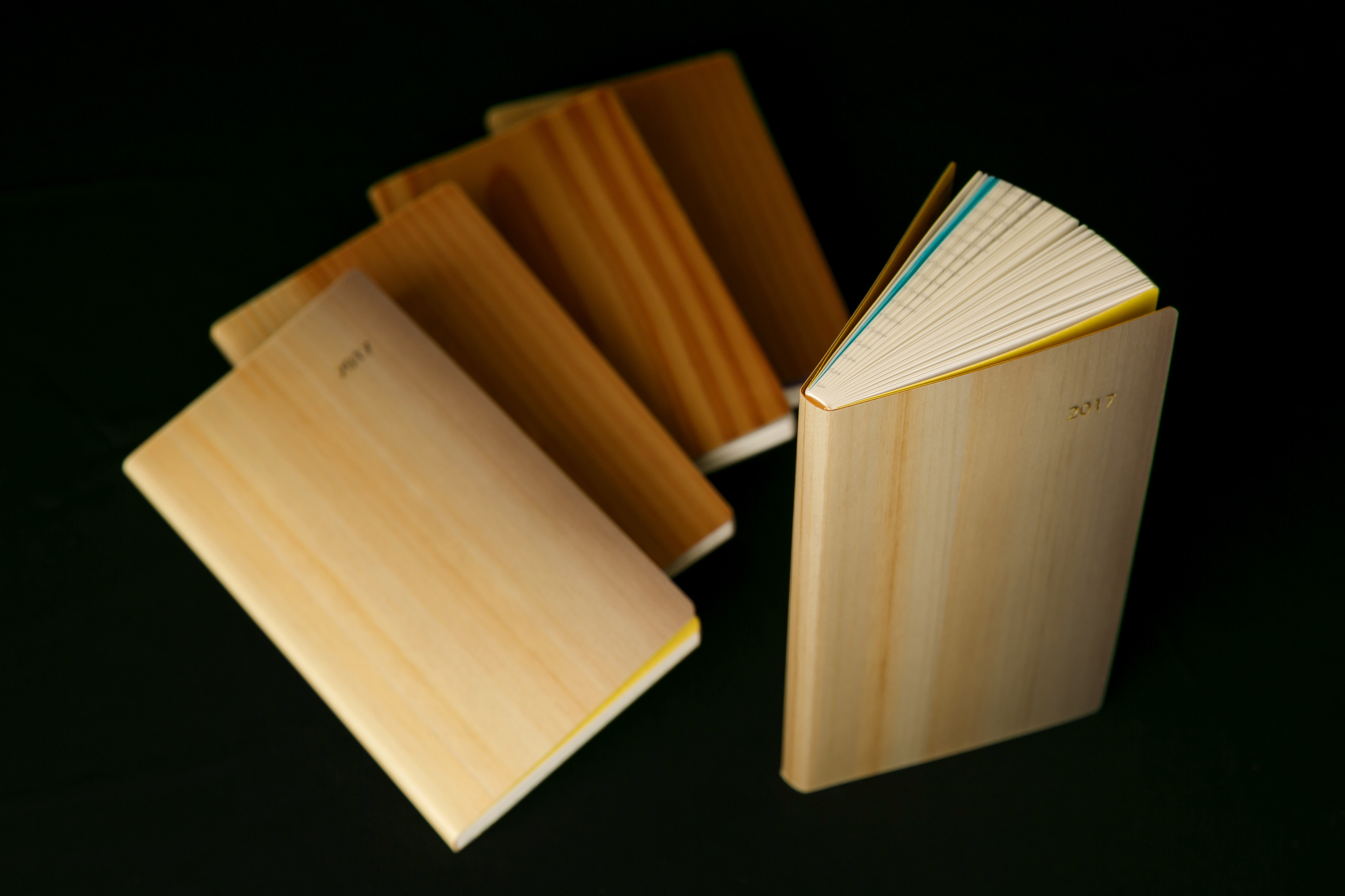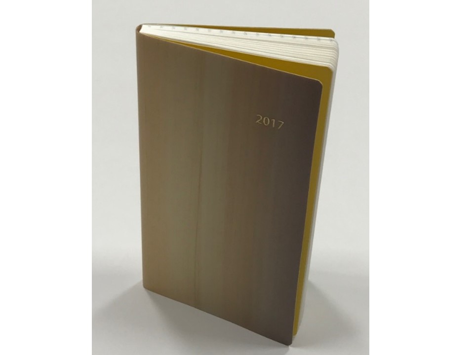 会社PRの販促ツールとして、いつも身近に携えていただける手帳やノートを毎年樹種を変えて制作。2017年の手帳には東京都産と埼玉県産のヒノキツキ板を使用し、グラデーション加工を施して美観を高めた表紙にした。顧客や展示会来場者をメインに配布し、ウェブサイトで一般の方にも抽選で発送した。