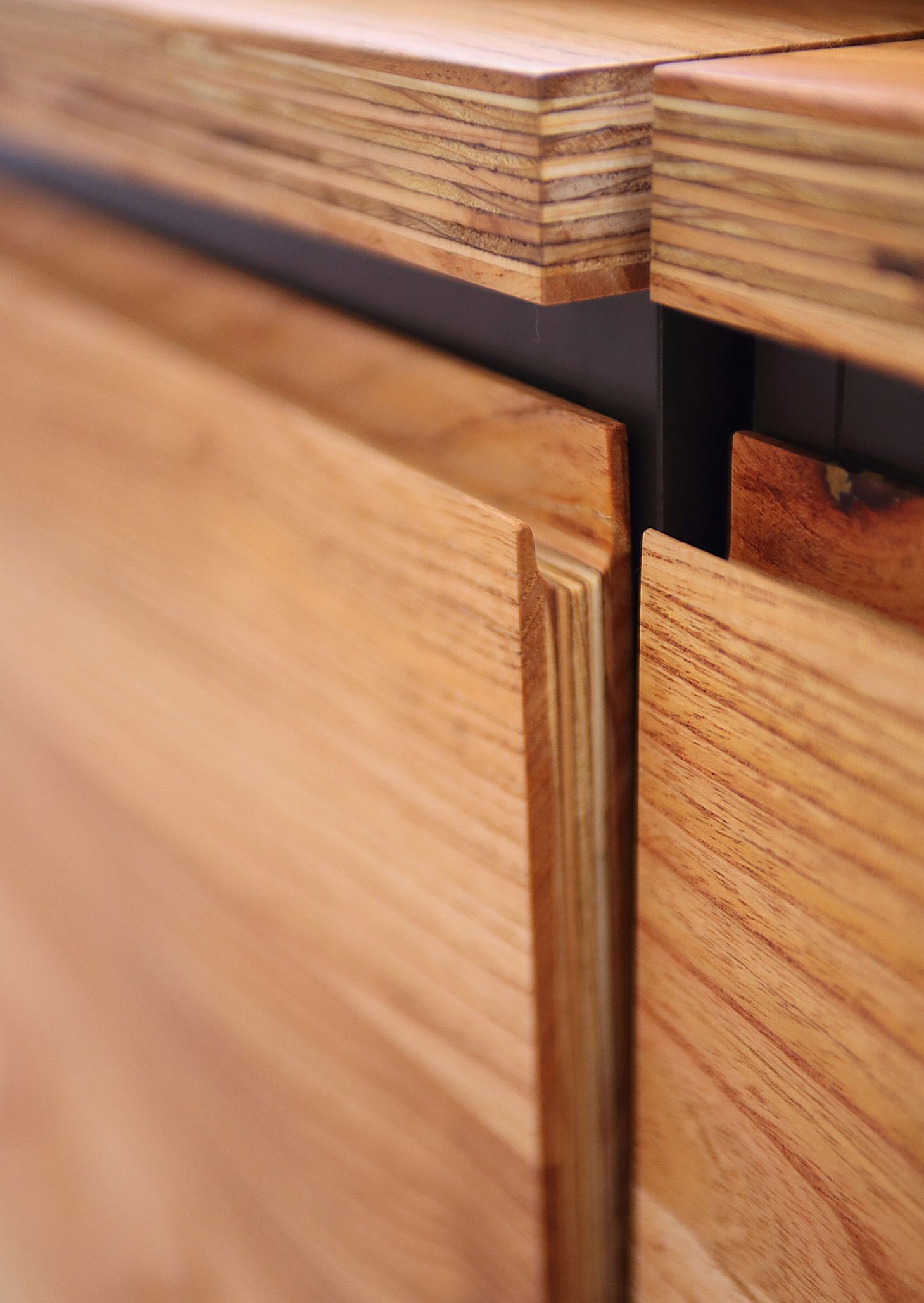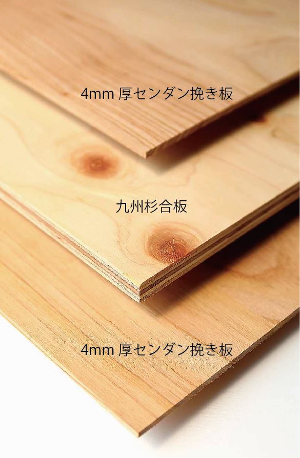 国産の杉合板をベースに両面にセンダンのt4mm挽き板を貼り合せパネル化した。これで薄くて寸法安定性を維持しながら、広い部材の製作が可能になった。しかも、表面はt4mmの無垢材なので、ビスの保持力も高まり、表面の凹凸加工も、多少の面取りも無垢板と同様に加工できる。ケヤキに似た豊かな表情をもつ材となった。