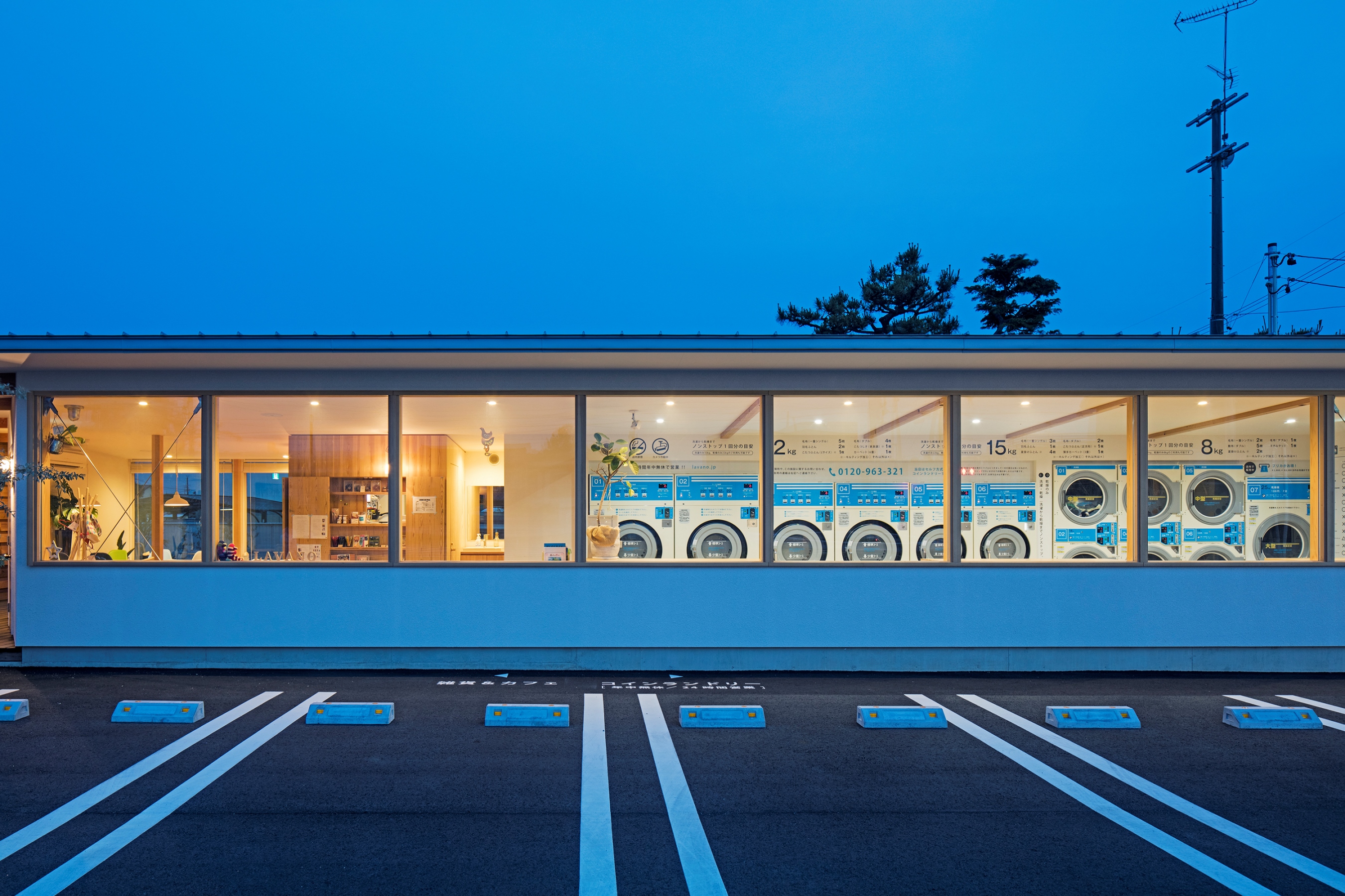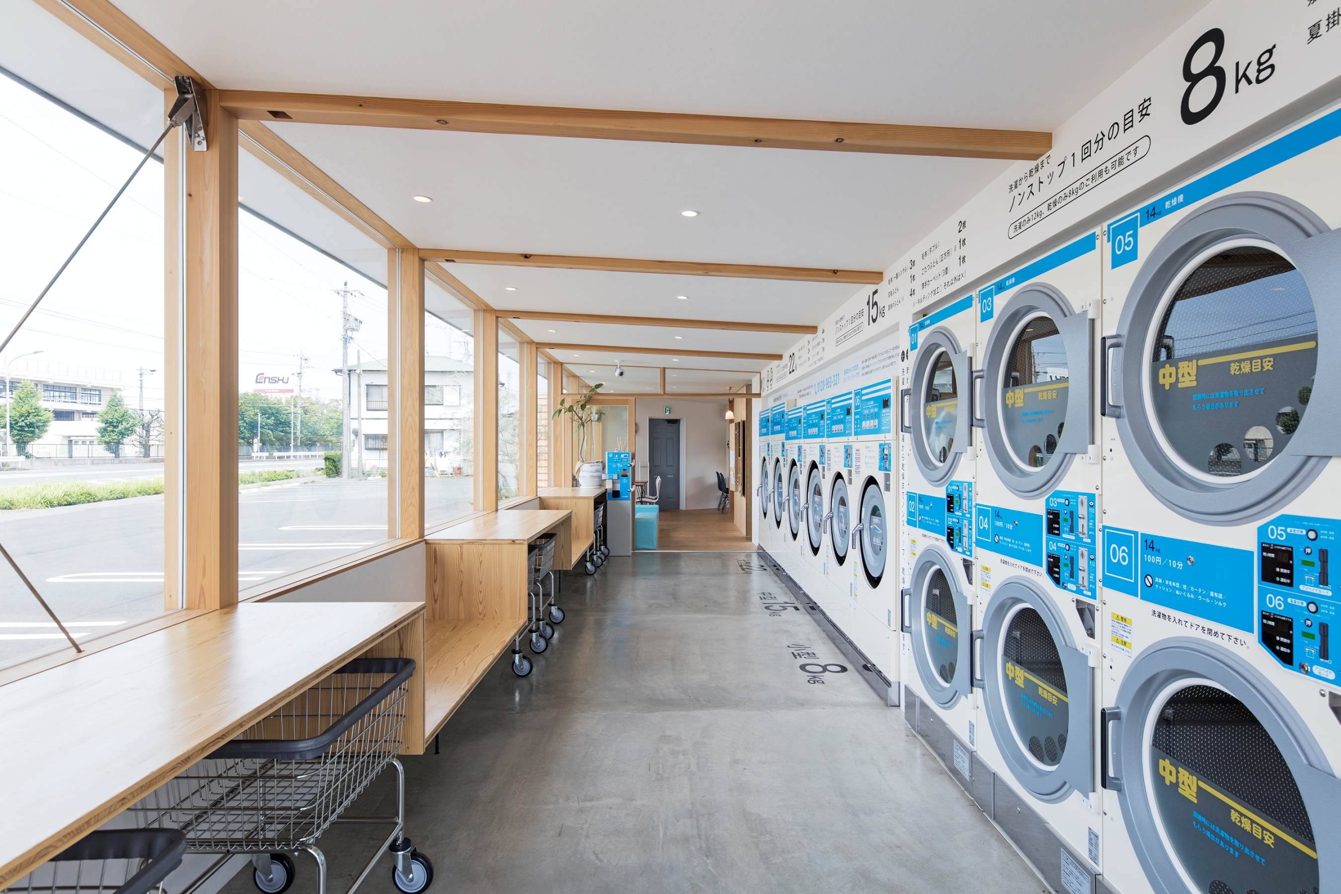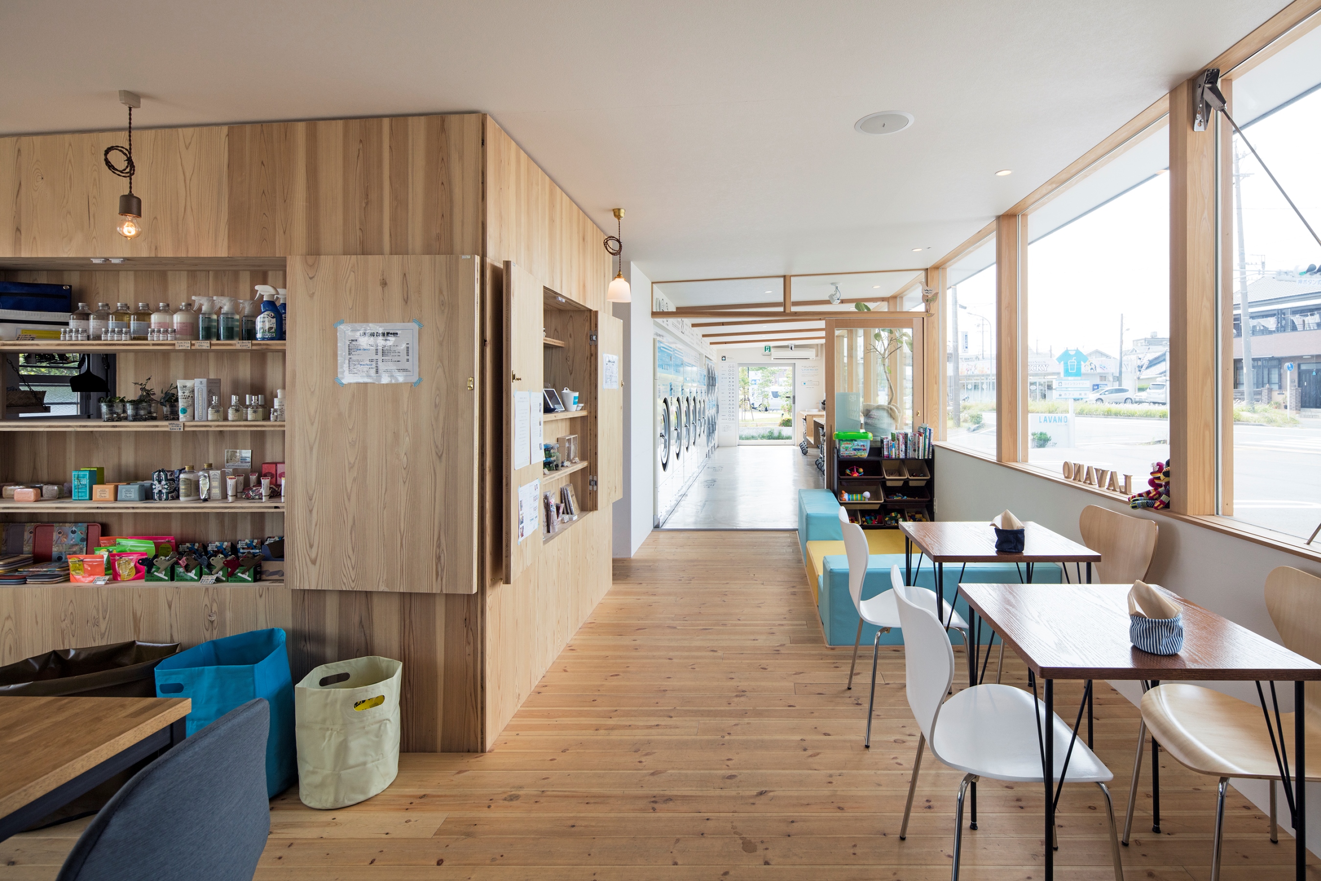 コインランドリーの利用者層が多様化するなか、滞在時間の長さや車での利用の増加などを背景に木質化によって居心地の良さを提供している。待合室やサロンのような空間で地域コミュニティの場としての機能も読み込まれている。